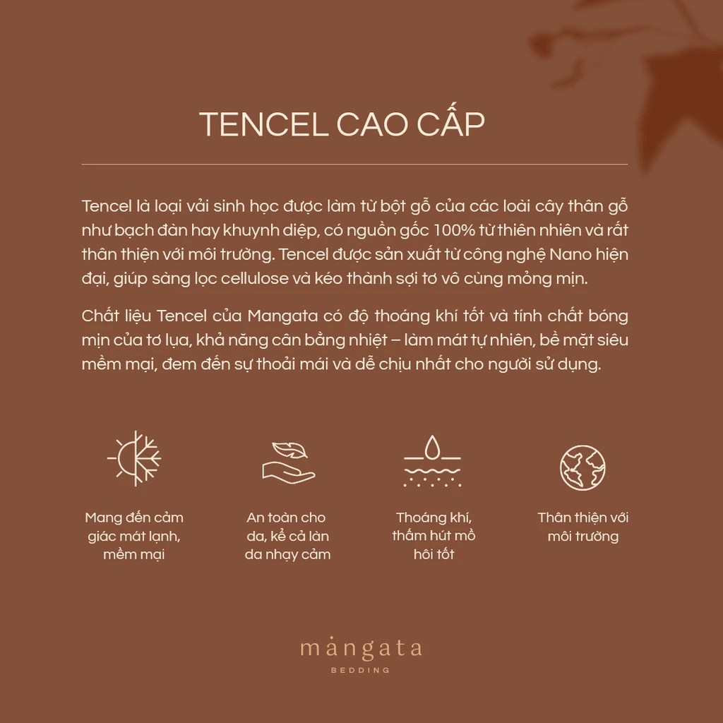 Bộ chăn ga gối lụa Tencel 60s cao cấp nhiều họa tiết MANGATA BEDDING được làm từ vải Tencel - loại vải sinh học từ bột gỗ của các loài cây thân gỗ như bạch đàn, khuynh diệp, 100% thiên nhiên với 4 ưu điểm: